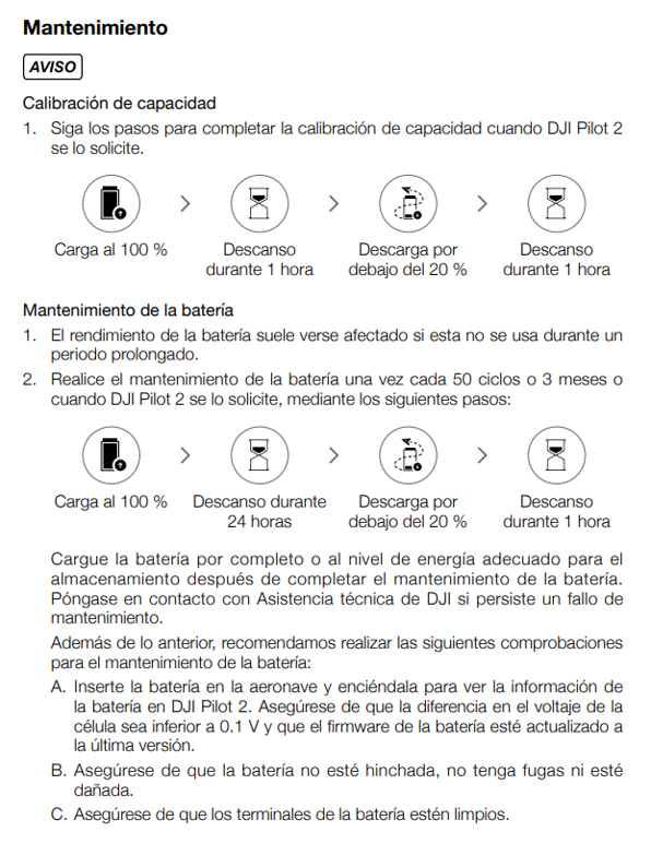 - Cuando la temperatura de la batería es inferior a 18 °C (64.4 °F), el autocalentamiento comienza una vez que se inserta en la aeronave y se enciende. Después del despegue de la aeronave, la función de autocalentamiento se apagará automáticamente. Cuando la temperatura de la batería sea inferior a 10 °C (50 °F), la aeronave no despegará. Espere hasta que la batería se caliente antes de operar la aeronave.