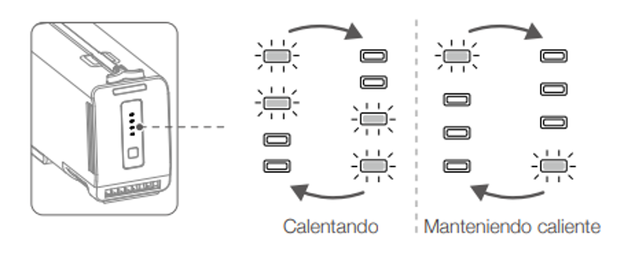- Los ledes de nivel de batería parpadearán de la siguiente manera cuando la batería se esté calentando y manteniendo caliente