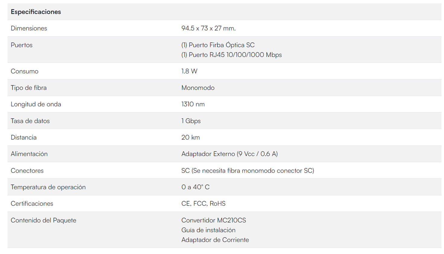 Convertidor Fibra Óptica Monomodo Hasta 20 Km