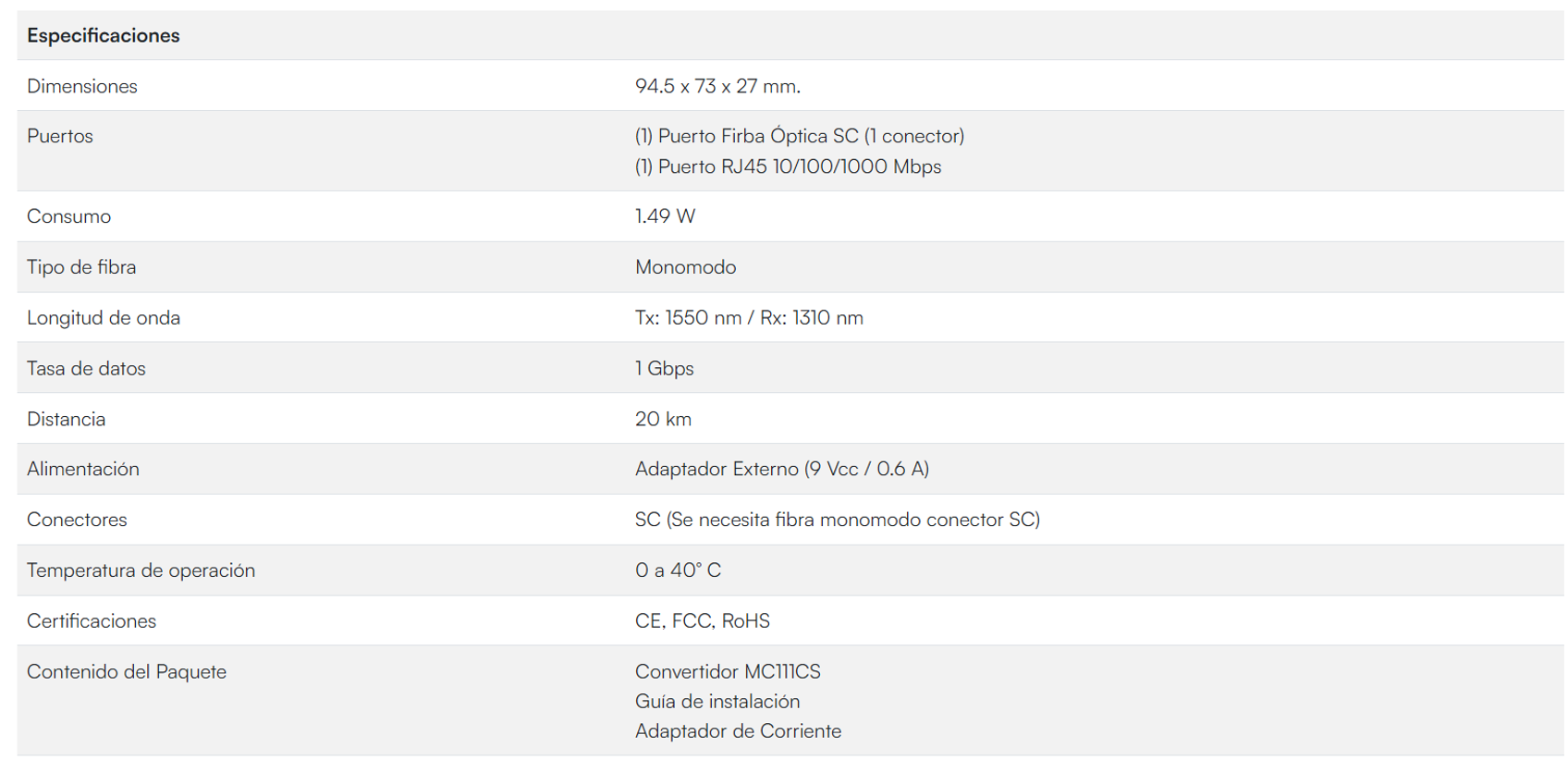 Convertidor Fibra Óptica WDM Monomodo para Modelo MC112CS