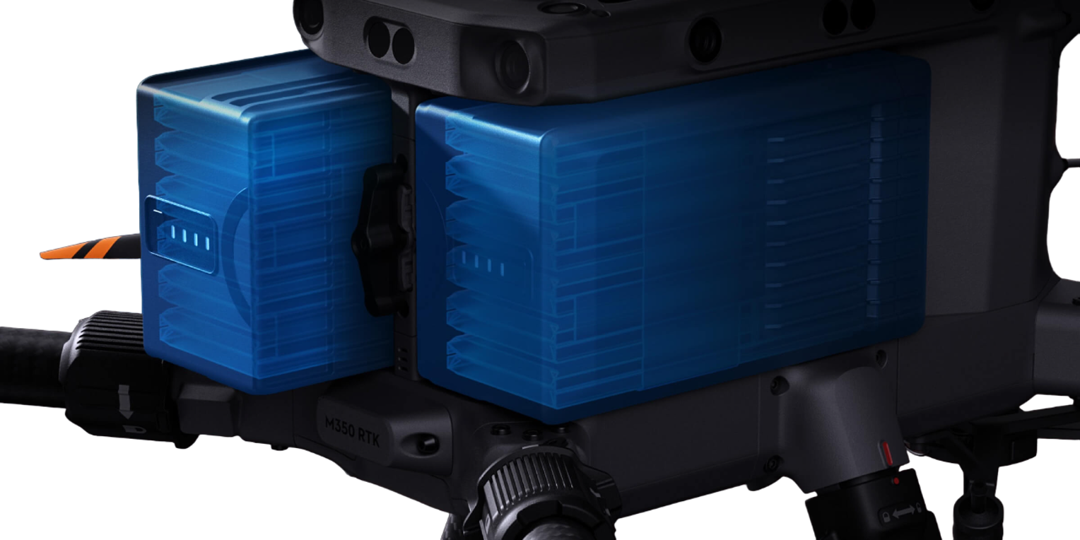 El Matrice 350 RTK está equipado con un nuevo sistema de doble batería TB65 que admite cambio en caliente y permite volar varias veces sin tener que apagarlo. La batería permite hasta 400 ciclos de carga, lo que reduce el coste de cada vuelo.