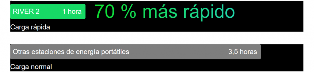 RIVER 2 supera la velocidad promedio de carga en la industria, realizando una carga completa en tan solo 60 minutos*. Es decir, un 70% más rápido que otras estaciones de energía portátiles del mercado y un 38% más rápido que las generaciones anteriores.
