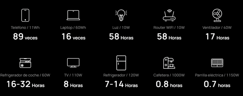 - Salidas USB-C: 2 puertos, 5/9/12/15/20 v, 5A, 100W máx.