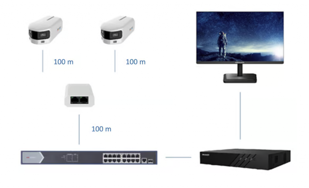 Los Switches PoE de Hikvision permiten al momento de utilizar un extensor PoE Hikvision modelo DS-3E0103DP-E/R o DS-3E0503DP-E/R alcanzar distancias de hasta 200 metros