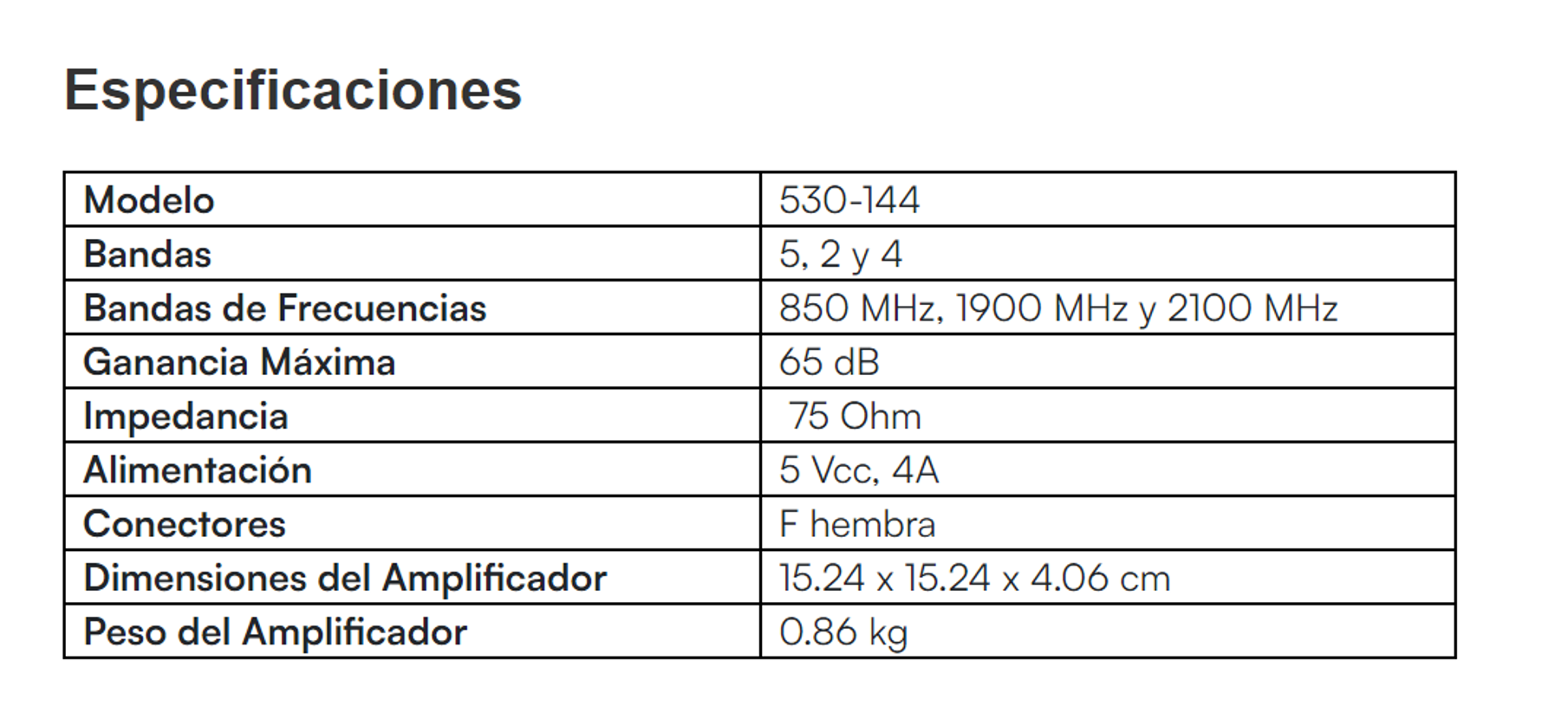 Amplificador de señal, antena interior tipo panel con montaje para pared, fuente de alimentación CA a CD, antena exterior tipo direccional con montaje para tubo, dos jumpers de cable coaxial tipo RG6 de 4.57 m y un jumper de cable coaxial tipo RG6 de 9.14 m.