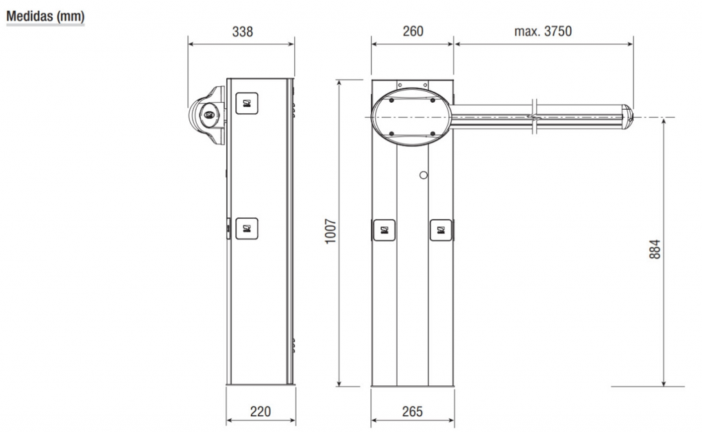 - Fotoceldas CAME: 001-DIR10, diseñadas para proteger peatones en el área de acción del mástil de la barrera. Ancho de carril efectivo de hasta 10 metros.