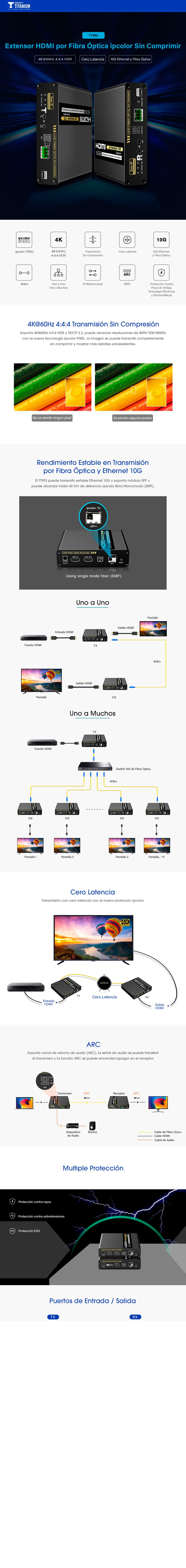 El kit TT-993 es un extensor HDMI que forma parte de la familia ipcolor, la imagen es completamente nítida ya que esta se envía sin comprimir en resolución 4K 60Hz a través de fibra óptica llegando a alcanzar distancias de hasta 40 KM te ofrece un mayor contraste y colores vivos para una experiencia de visualización más realista, además la conexión puede ser 1 a 1 o 1 a muchos mediante la conexión de un Switch 10G Se trata de una solución IP de más de 10G, a un precio muy accesible.