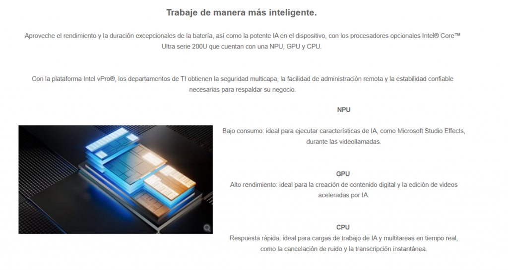 Creados para laptops de primera calidad, los procesadores Intel® Core™ Ultra incluyen aceleración de IA integrada para aumentar la productividad, a la vez que mantienen la privacidad y la flexibilidad.