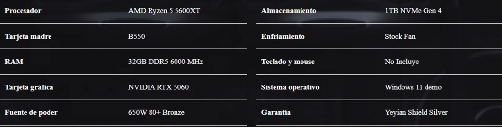PC GAMER YEYIAN VAULT RYZEN 5 5600XT 32GB DDR4 RTX 5060 1TB NVME WIN 11 PRO DEMO