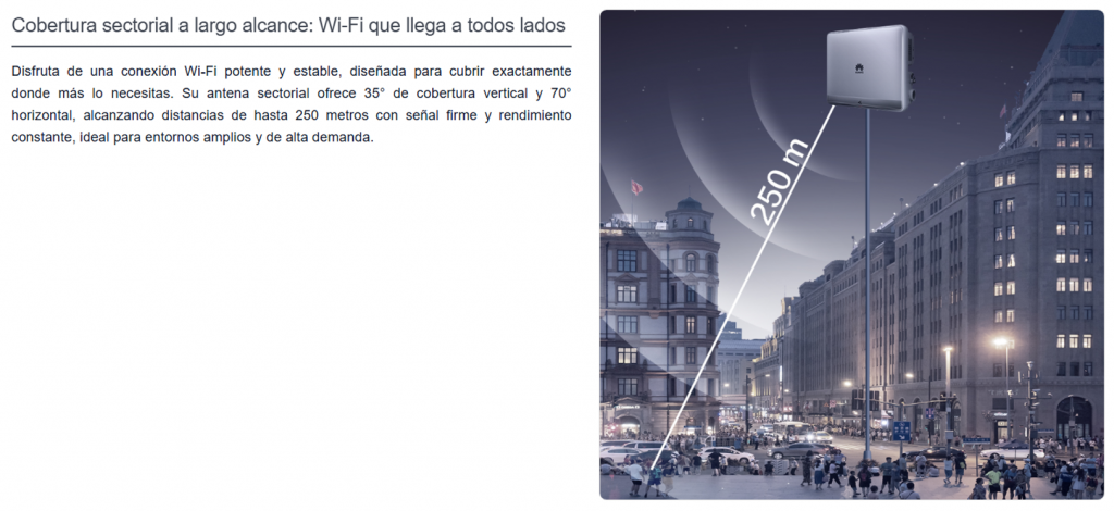 El Huawei eKitEngine AP772E es un punto de acceso Wi-Fi 7 para exteriores con seis flujos espaciales que ofrece una experiencia inalámbrica superior. Destaca por su amplia cobertura con su antena sectorial, protección IP68 y alta resistencia a sobretensiones, ideal para estadios, plazas y parques de alta densidad.