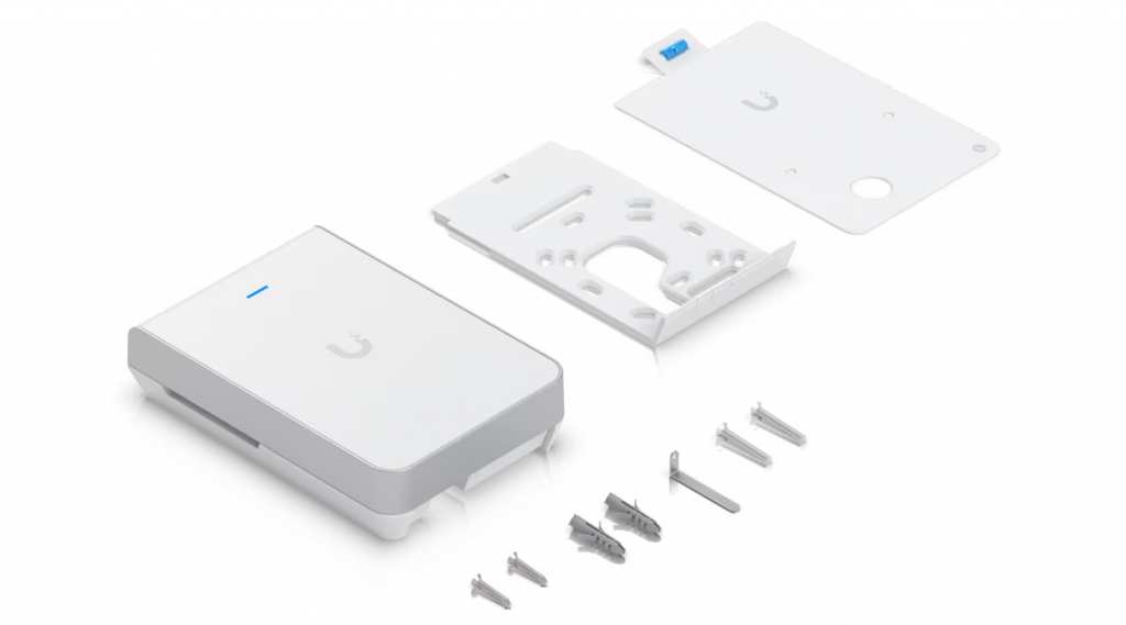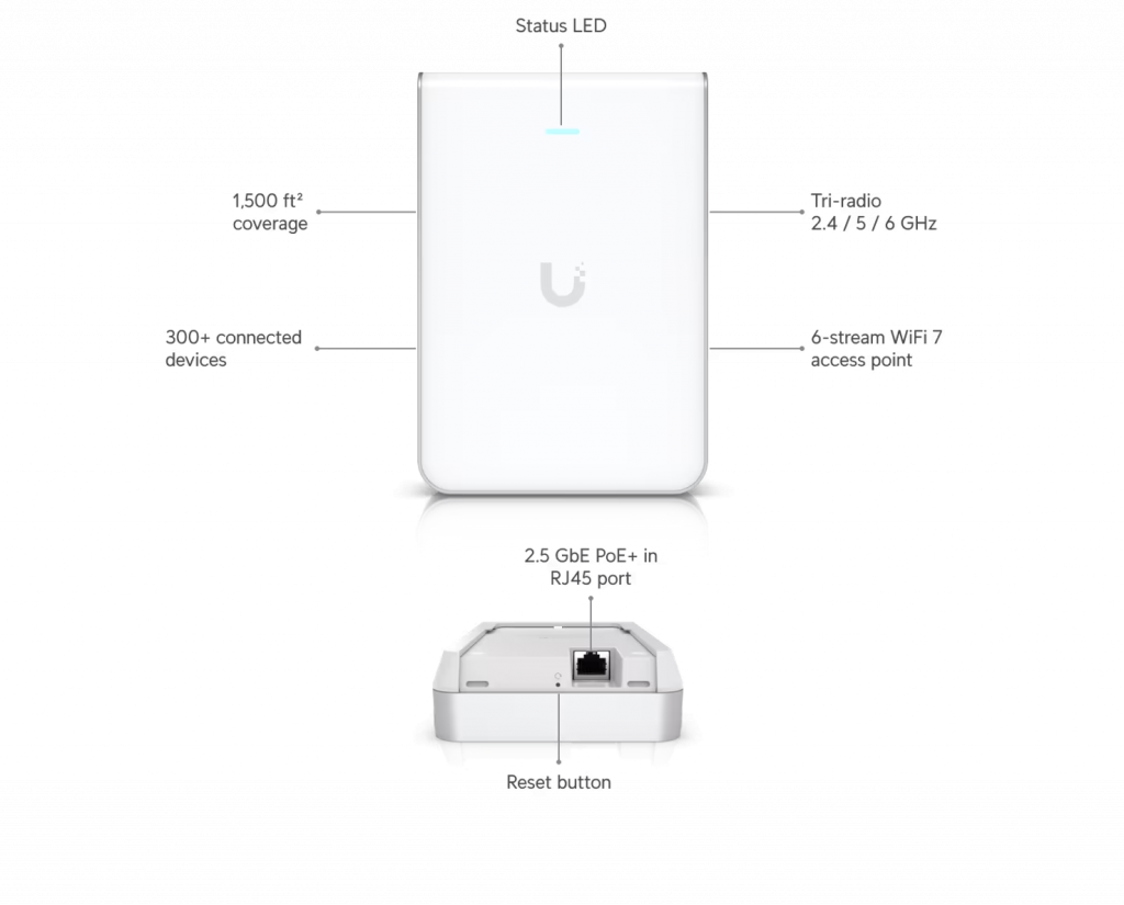 Punto de acceso WiFi 7 montado en la pared con 6 transmisiones espaciales y soporte de 6 GHz diseñado para constructores de viviendas con opciones de instalación perfectas.