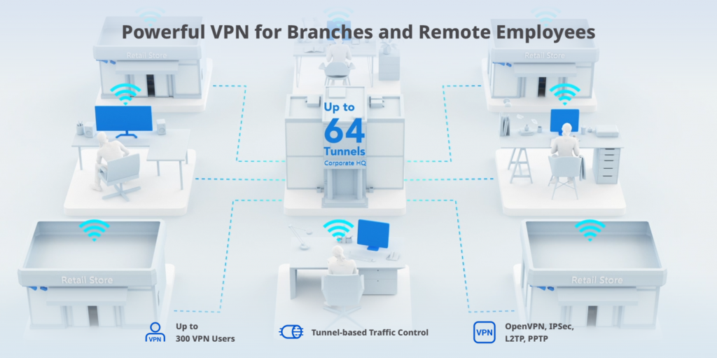 • VPNs: IPSec, WireGuard, L2TP, PPTP, y OpenVPN / *Desempeño de 100-540 Mbps / *Tuneles 64