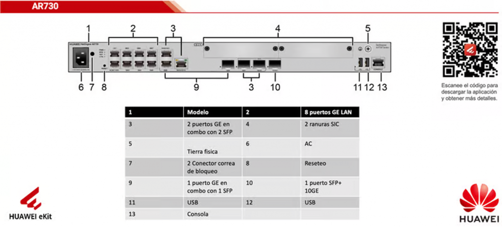- Puertos: 2 x 10/100/1000BASE-T port combo 2 x GE SFP + 1 x 10GE SFP+ (WAN) + 8 x 10/100/1000BASE-T port(WAN/LAN).