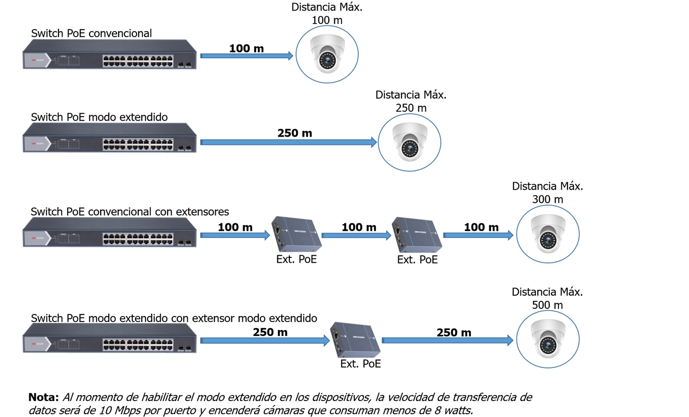 Los Switches PoE de Hikvision permiten al momento de utilizar un extensor PoE Hikvision modelo DS-1H340101P alcanzar distancias de hasta 500 metros, claro esto con la condición de que las cámaras IP de Hikvision no superen los 8 Watts de consumo total.