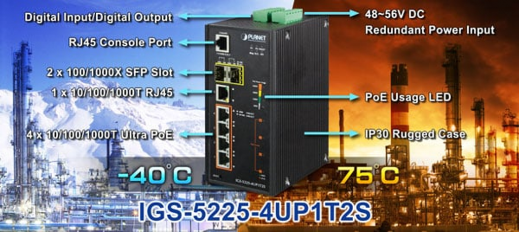 El Switch Gigabit Ultra PoE de 4 puertos Industrial PLANET, endurecido para el medio ambiente, IGS-5225-4UP1T2S, está equipado con una resistente carcasa de metal IP30 para un funcionamiento estable en entornos industriales pesados y exigentes. Por lo tanto, el IGS-5225-4UP1T2S proporciona un alto nivel de inmunidad contra la interferencia electromagnética y las fuertes sobrecargas eléctricas que generalmente se encuentran en los pisos de las plantas o en los gabinetes de control de tráfico en la acera. Al poder operar en un amplio rango de temperatura de -40 a 75 grados C, el IGS-5225-4UP1T2S se puede colocar en casi cualquier ambiente difícil. El IGS-5225-4UP1T2S también permite el montaje en riel DIN o en la pared para un uso eficiente del espacio del gabinete.