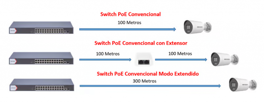 Los Switches PoE de Hikvision permiten al momento de utilizar un extensor PoE Hikvision modelo DS-3E0103DP-E/R o DS-3E0503DP-E/R alcanzar distancias de hasta 200 metros