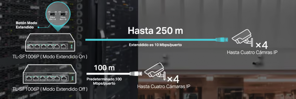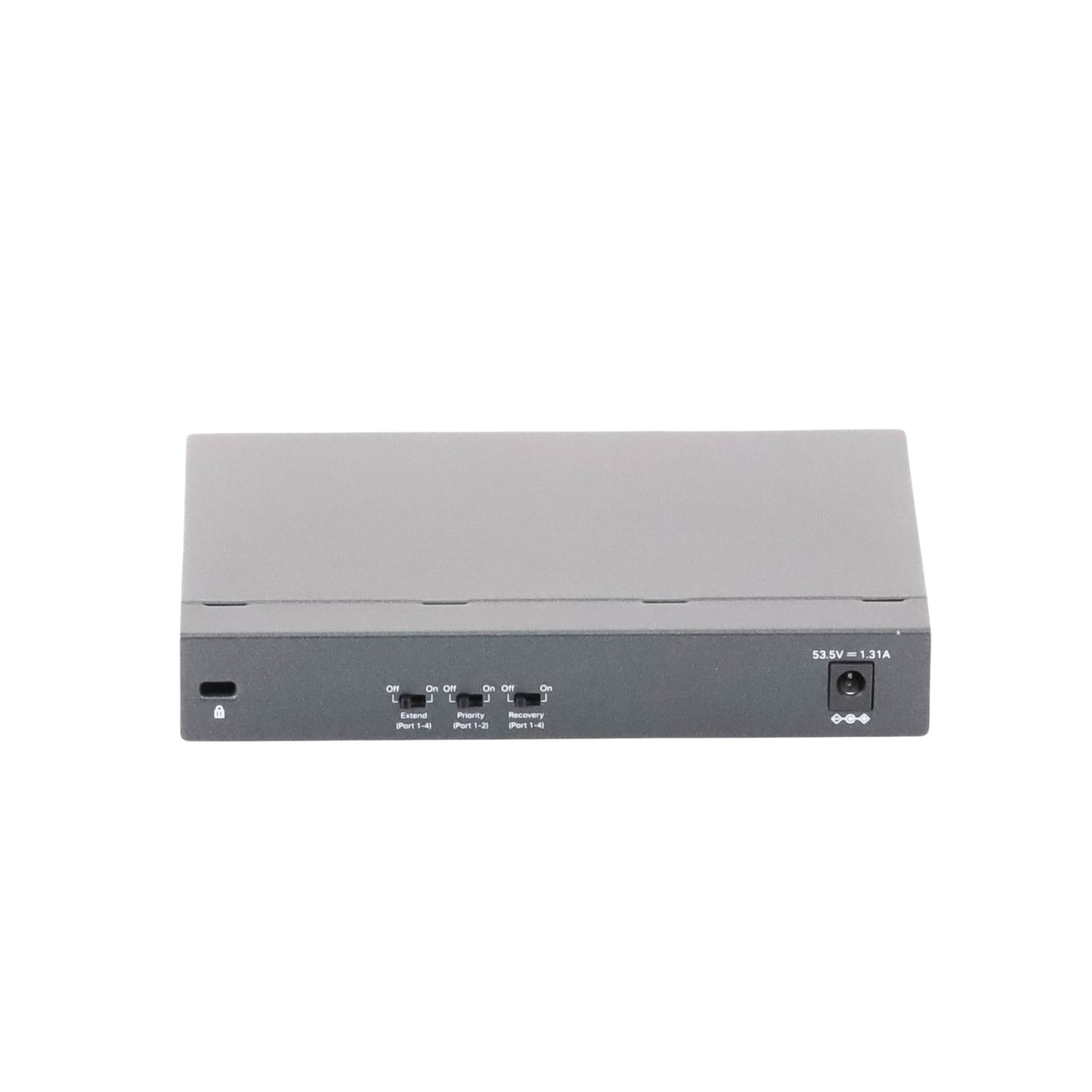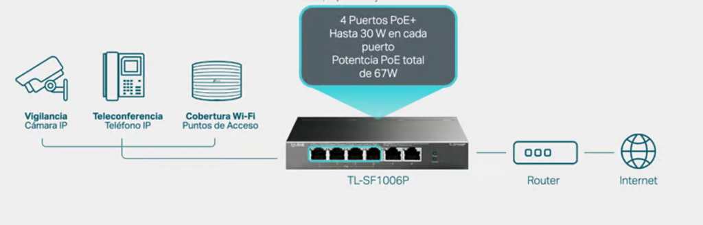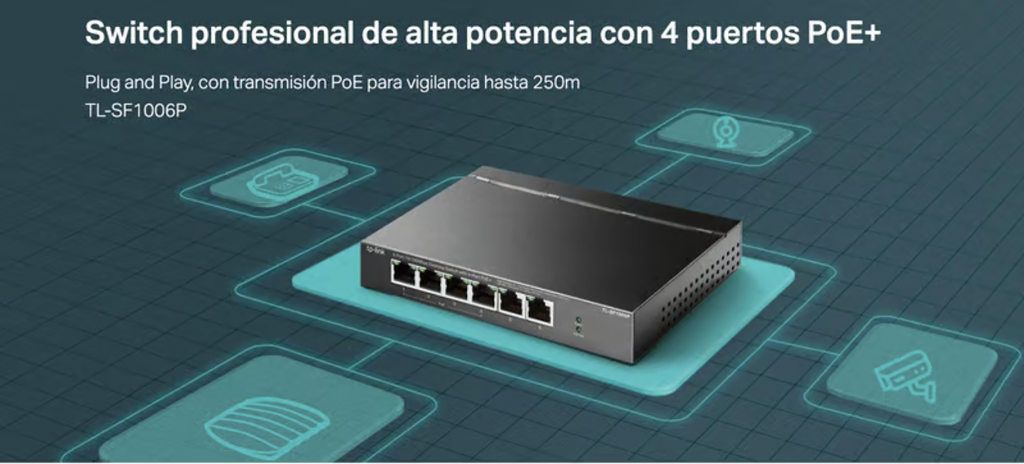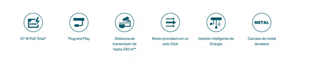 | Puertos | (4) puertos RJ45 10/100 Mbps PoE (2) puerto RJ45 10/100 Mbps Estándar copatible con PoE 802.3 af/at |