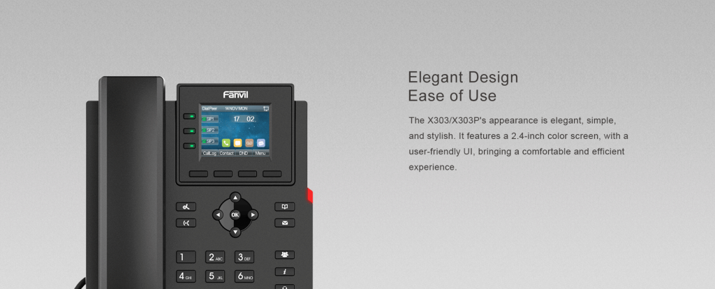 X303P es el teléfono SIP rentable con pantalla a color y alto rendimiento, especialmente para empresas. Cuenta con una pantalla a color de 2.4 pulgadas y 320×240 píxeles, que admite 4 líneas SIP y conferencias locales de 6 participantes para brindar una experiencia fácil de usar. X303P tiene funciones como audio HD, puertos de red duales de 10/100 Mbps y PoE integrado, proporcionando una experiencia de comunicación empresarial eficiente y de alta calidad para las empresas.