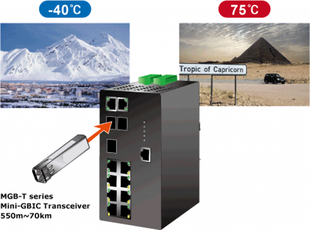 Para satisfacer la creciente demanda de las soluciones industriales, Planet lanza los transceptores 1000BASE-SX/LX/BX de la serie MGB-T que pueden funcionar de manera confiable en un amplio rango de temperatura (-40° a 75°) eléctricamente riguroso, ambiente climáticamente exigente. Los transceptores 1000BASE-SX/LX/BX de la serie MGB-T proporcionan una conexión 1000BASE-SX/LX/BX fácil y rápida para equipos en zonas industriales.